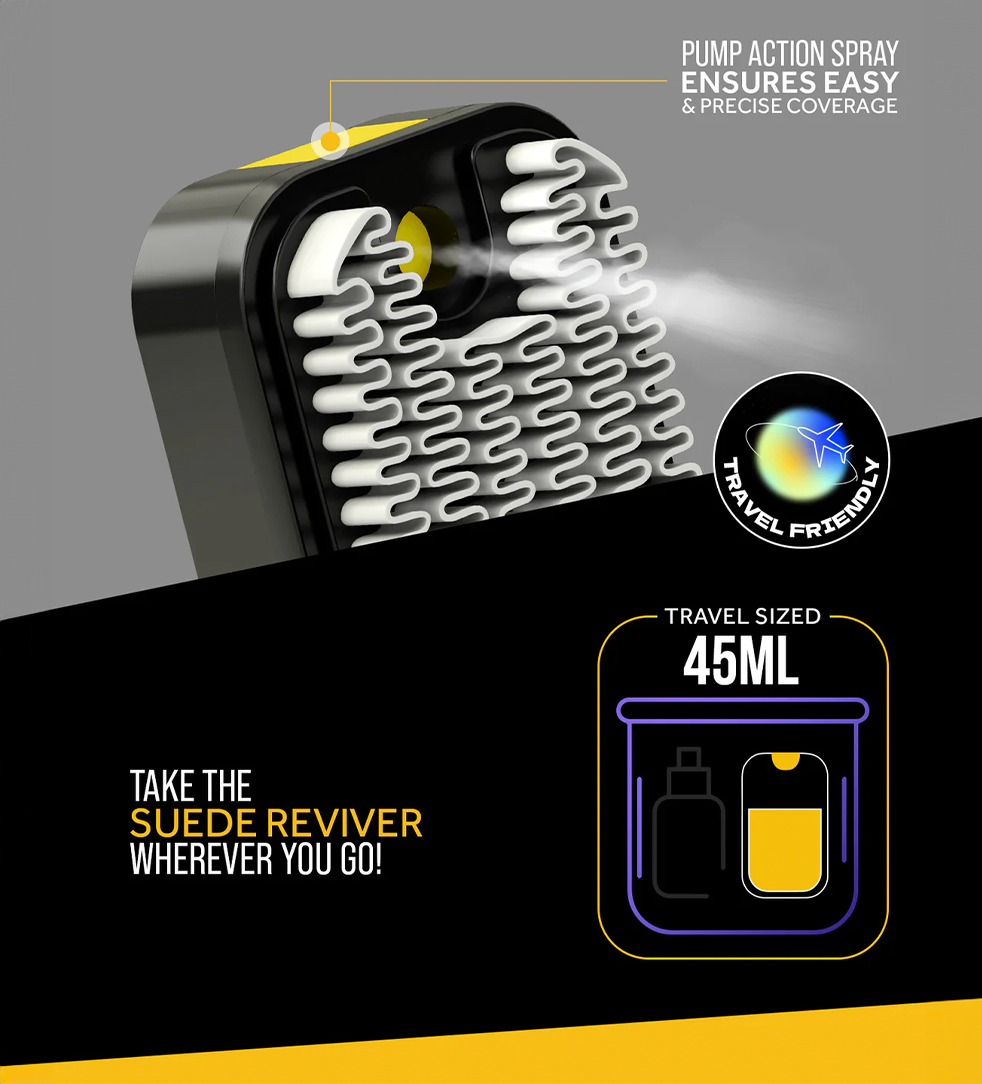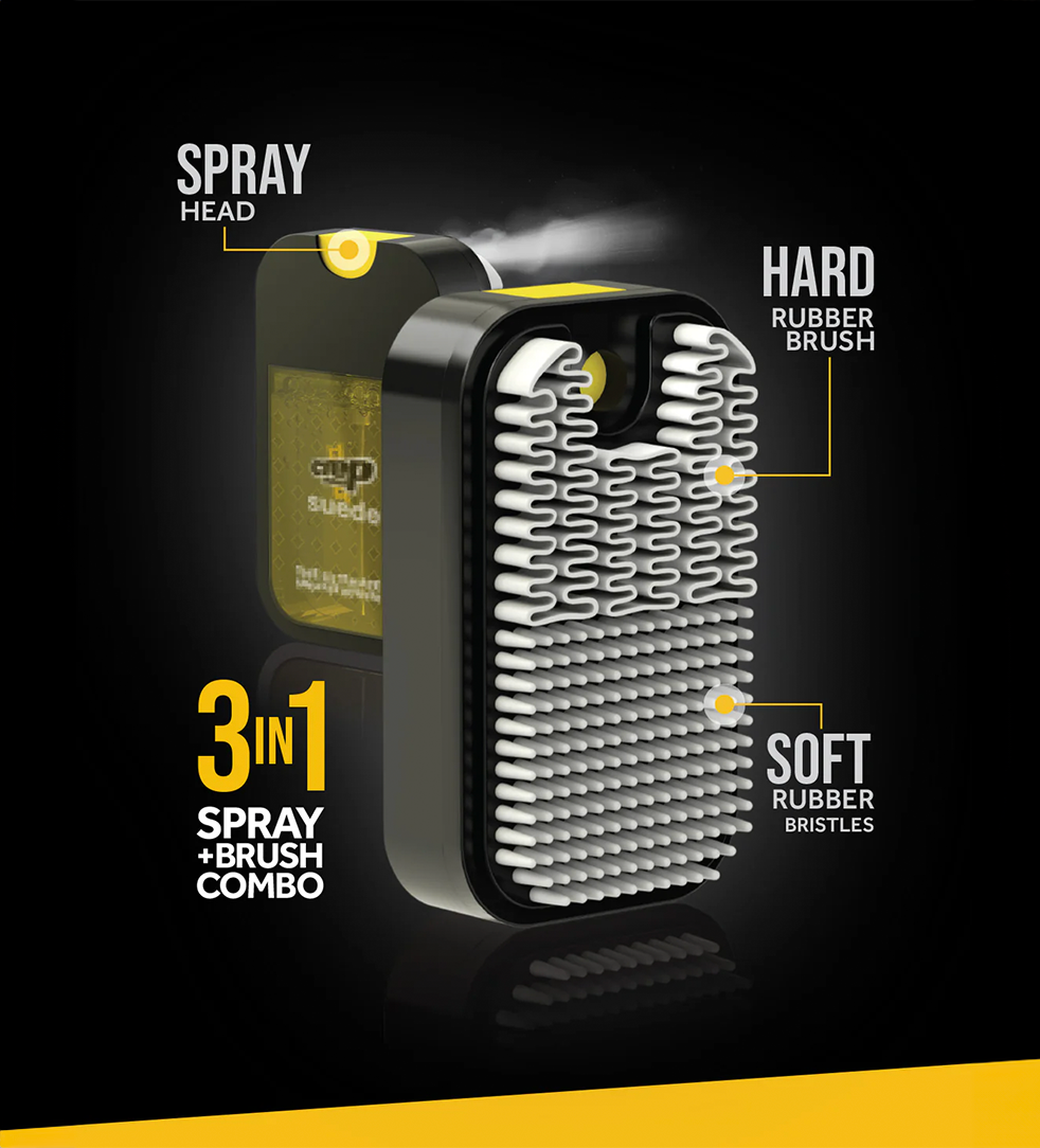 It is a 3-in-1 spray and brush combo that restores the original texture of your suede and nubuck sneakers and brightens their overall appearance.